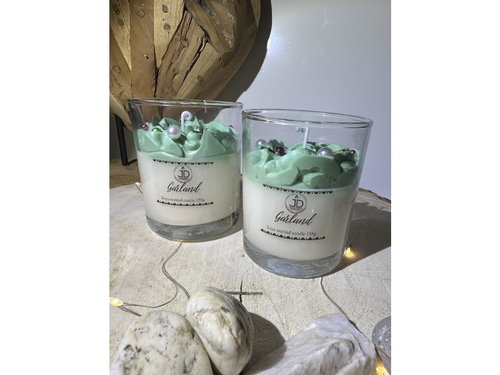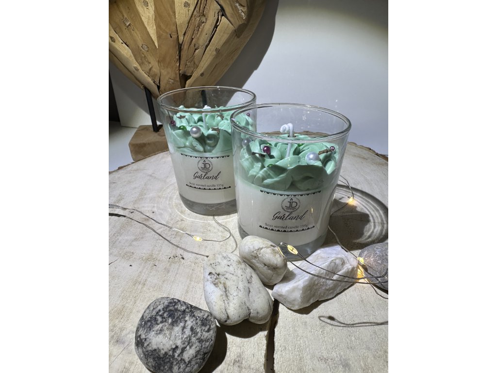 Svíčka Garland je elegantní sójová svíčka ve skle, která připomíná slavnostní vánoční čas. Bohatý základ doplňuje zelená „šlehačková“ vrstva s jemnými perličkami, jež evokují ozdoby na vánočním věnci. Působí čistě, svátečně a hřejivě – jako tichý večer plný světýlek a klidu.